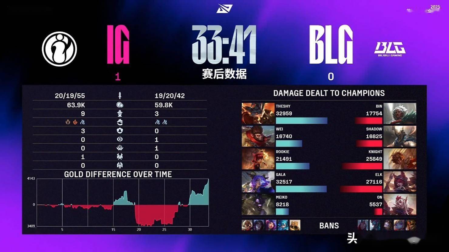 中期wei猴子绕后,theshy兰博大招R五人,IG完美开团击杀BLG双C后,拿下听牌龙。19分钟theshy兰博下路被抓死,IG中路越塔四打五被BLG包夹,BLG团灭IG。20分钟meiko牛头野区被抓死,BLG拿下厄塔汗。26分钟IG推掉了BLG中路一塔,BLG直接开团,bin安蓓萨进场被秒,BLG阵容被冲散,IG击杀BLG上野后,拿下第一条大龙,不过BLG赶来击杀IG四人。后期32分钟wei猴子闪现开团,IG击杀BLG中辅后,拿下比赛的胜利。首局伤害最高的是theshy兰博,BLG这边伤害最高的是ELK霞。
