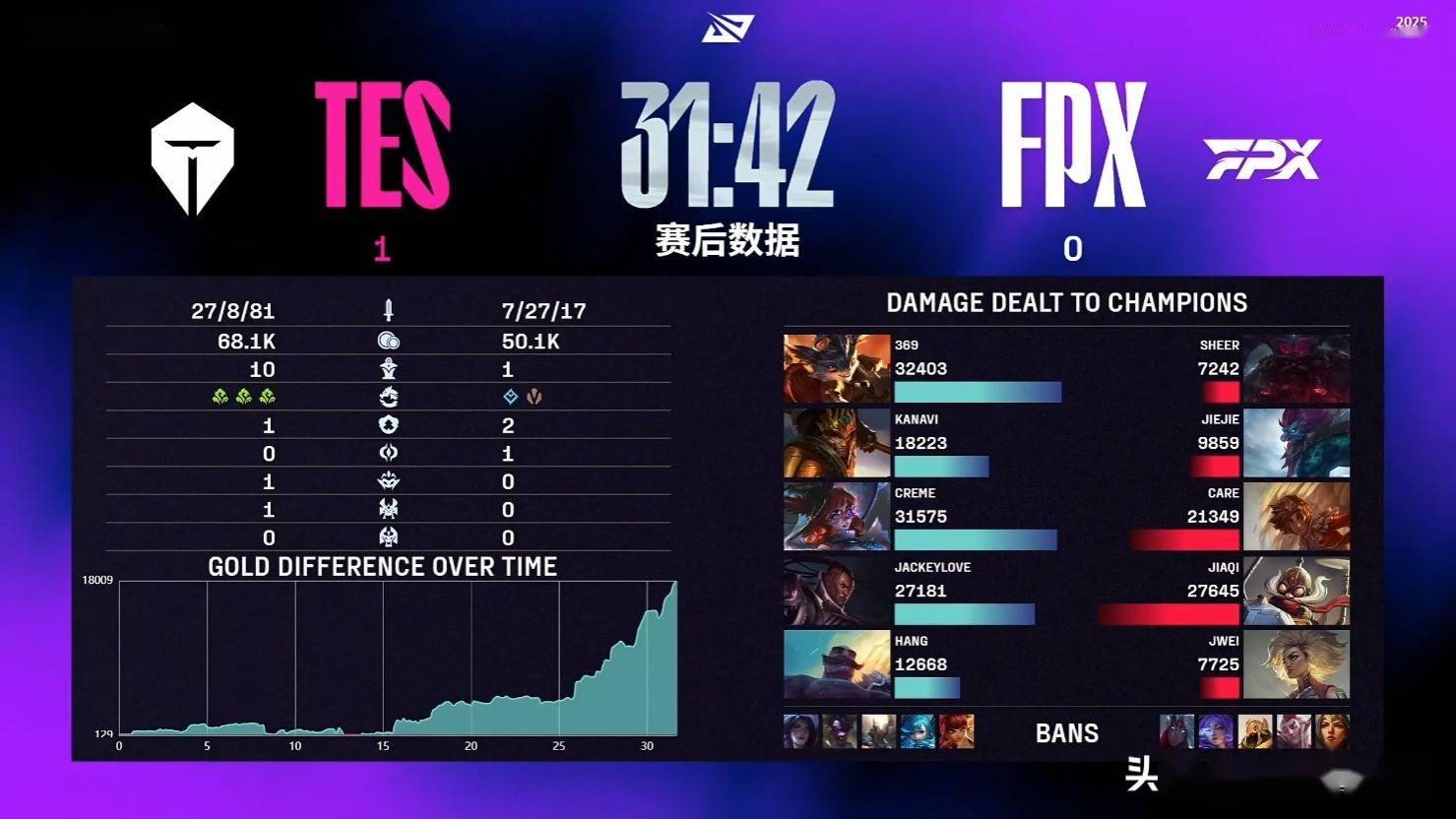 中期双方河道打出1换1后,TES拿下听牌龙。23分钟双方争夺小龙,Hang烈娜塔先被打残,之后creme瑞兹在龙坑被击杀,FPX打出3换5团灭TES后,拿下小龙,TES复活后拿下厄塔汗。25分钟TES光速偷下第一条大龙。29分钟FPX脸探草丛开团,但是kanavi奇亚娜R三人,TES打出0换4后,拿下火龙魂。后期31分钟jiejie赵信被秒,TES拿下第二条大龙,之后creme瑞兹开车绕后团灭FPX后,拿下比赛的胜利。