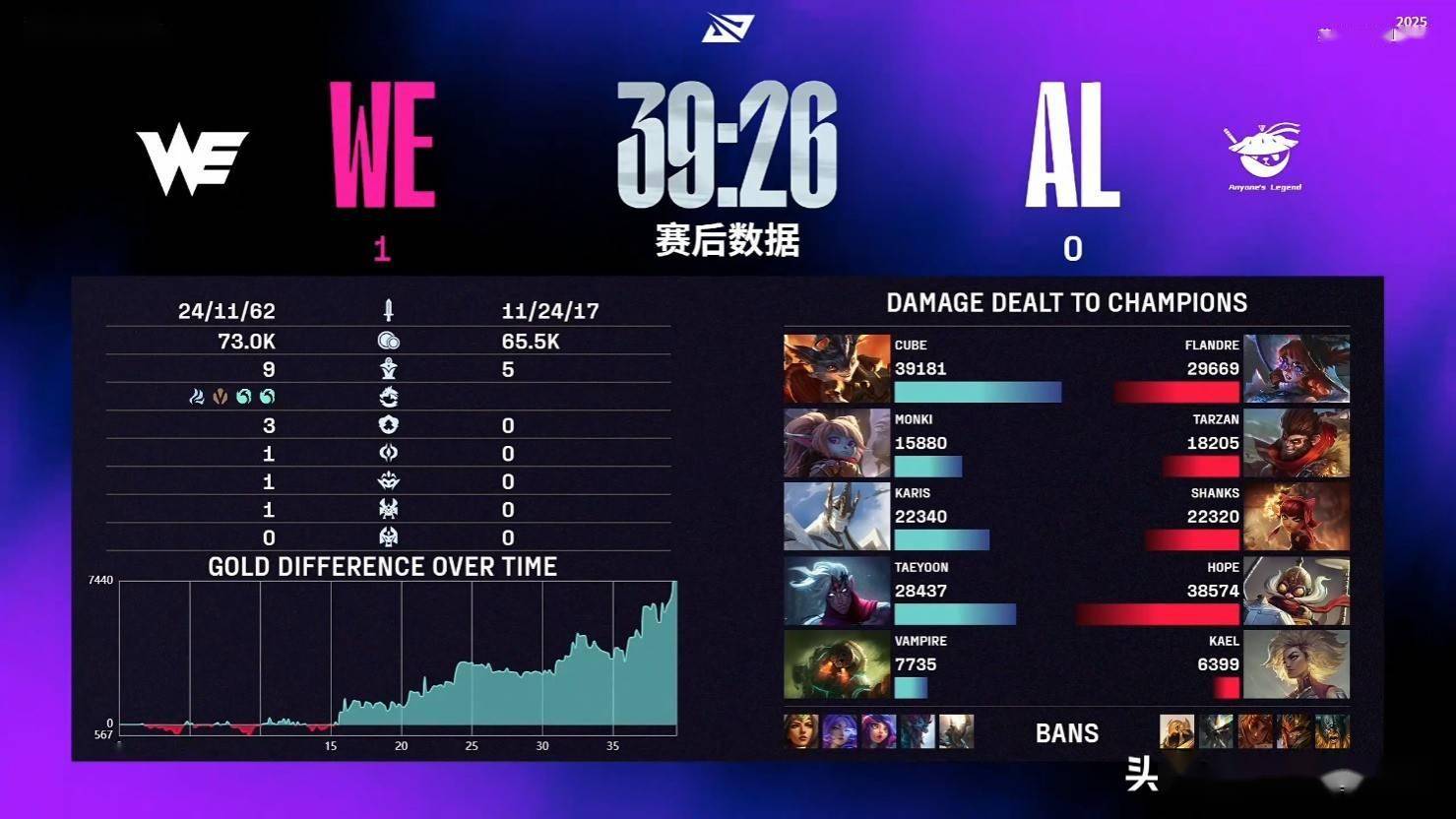 中期WE再次抓死shanks岩雀后,推掉了下路一血塔。21分钟WE无伤拿下听牌龙,AL想要推中路,WE拿下小龙后包夹击杀圣枪哥格温,WE顺势去打厄塔汗,AL其他人还想阻止,虽然击杀cube杰斯,但是karis阿卡丽进场收割,WE击杀AL四人后,拿下厄塔汗。27分钟AL拼尽全力击杀Karis阿卡丽,但是WE其他人收割,打出1换5团灭AL后,拿下水龙魂。28分钟WE大龙逼团,AL赶来后,shanks岩雀被秒,之后Karis阿卡丽游龙,WE再次团灭AL后,拿下第一条大龙。最终30分钟WE击杀AL四人后,拿下比赛的胜利。