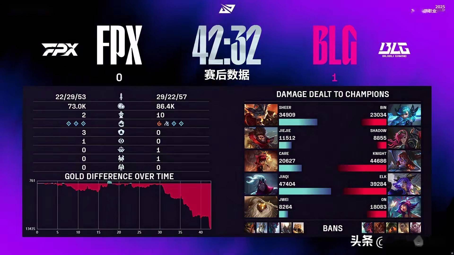 中期Knight阿萝拉单杀sheer兰博,之后BLG偷掉厄塔汗,27分钟双方中路混战,knight阿萝拉被击杀,FPX打出1换2后,拿下听牌龙。后期30分钟,Jiejie猴子中路开团被击杀,Knight阿萝拉直切后排,BLG打出3换5团灭FPX。32分钟BLG主动打大龙,FPX赶来阻止,虽然击杀BLG野辅,但是knight阿萝拉收割豪取3杀,BLG打出4换5再次团灭FPX。39分钟Care安妮失误被秒,BLG拿下电龙魂。最终41分钟双方野区混战,ELK芸阿娜伤害爆炸,Knight阿萝拉进场收割,BLG打出0换5团灭FPX后,拿下第一局的胜利。首局伤害最高的是JiaQi韦鲁斯,BLG这边伤害最高的是knight阿萝拉。
